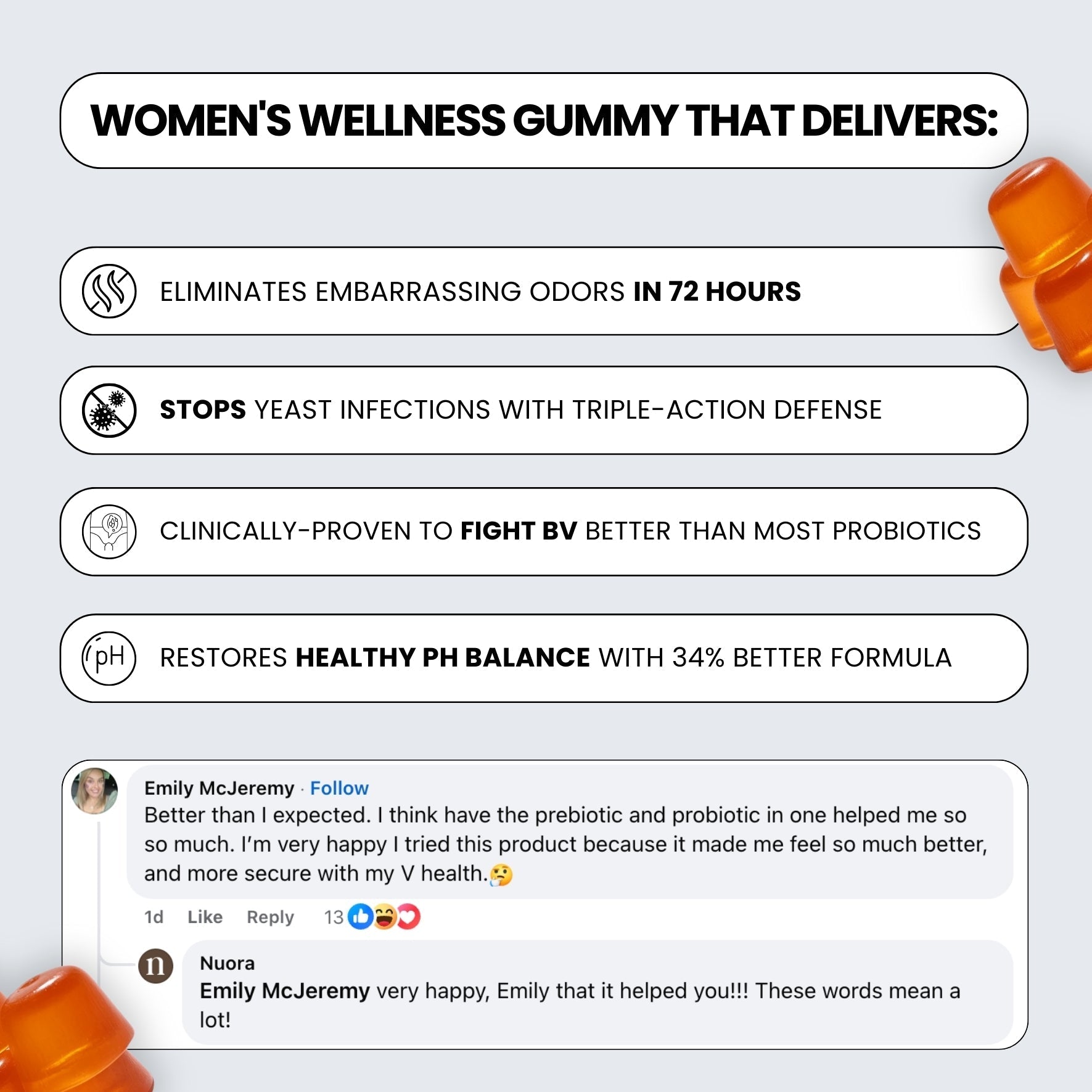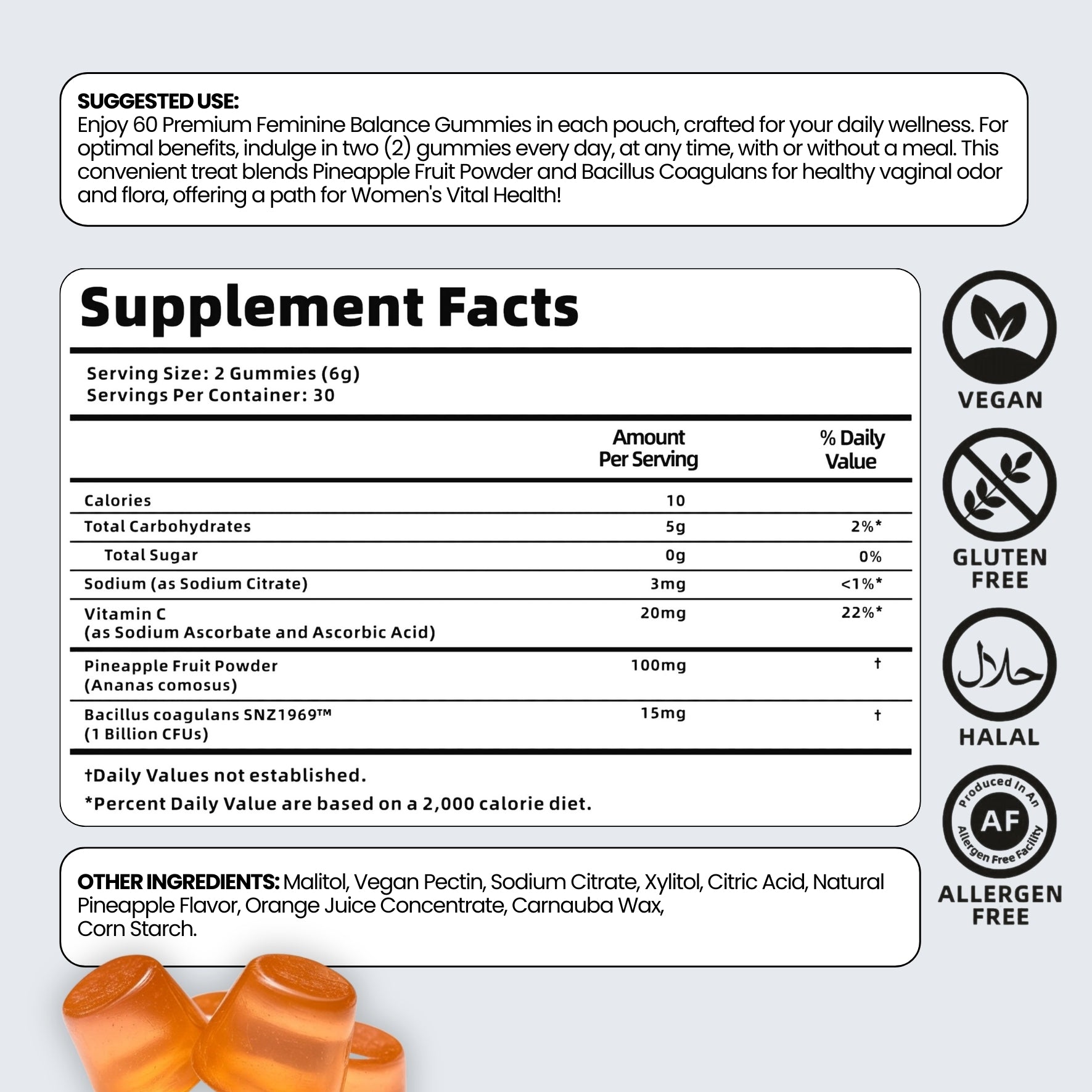 Gomitas Femeninas Premium. Formuladas con una mezcla exclusiva de probióticos, piña hawaiana y potente vitamina C